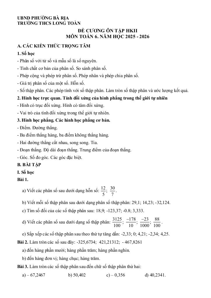 giaitoan.edu.vn giới thiệu đến quý thầy, cô giáo và các em học sinh đề cương ôn tập cuối học kì 2 môn Toán 6 năm học 2025 – 2026 trường THCS Long Toàn, phường Bà Rịa, thành phố Hồ Chí Minh.