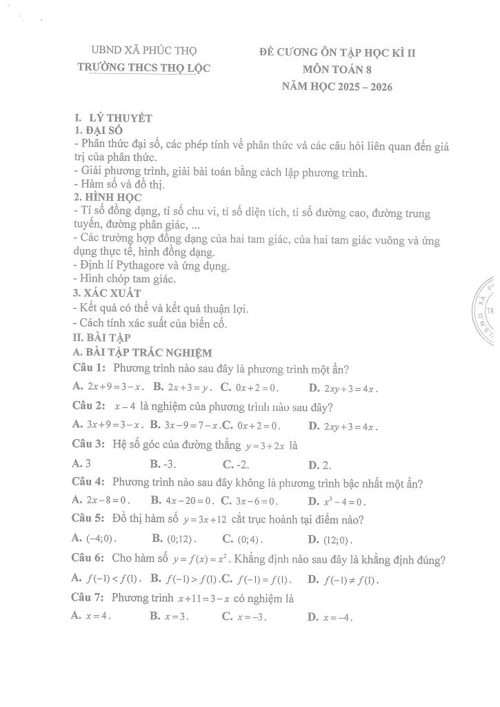 giaitoan.edu.vn giới thiệu đến quý thầy, cô giáo và các em học sinh đề cương ôn tập cuối học kì 2 môn Toán 8 năm học 2025 – 2026 trường THCS Thọ Lộc, xã Phúc Thọ, thành phố Hà Nội.