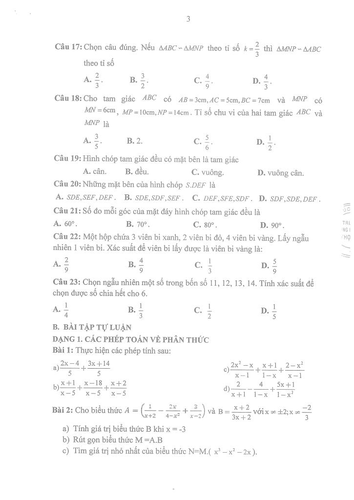 – Phân thức đại số, các phép tính về phân thức và các câu hỏi liên quan đến giá trị của phân thức.