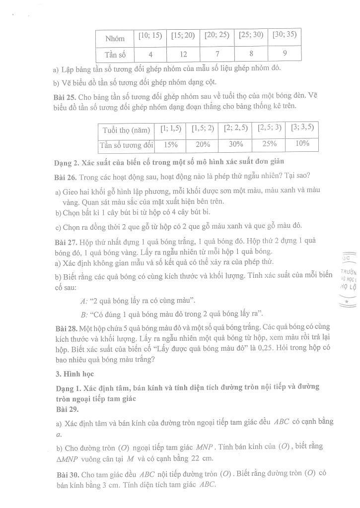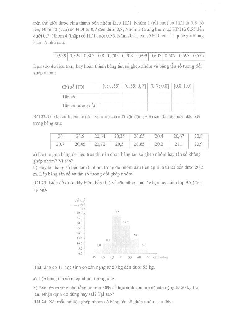 – Bảng tần số, tần số tương đối ghép nhóm và biểu đồ.