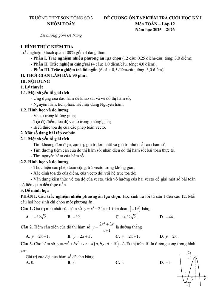 giaitoan.edu.vn giới thiệu đến quý thầy, cô giáo và các em học sinh đề cương ôn tập kiểm tra cuối học kỳ 1 môn Toán 12 năm học 2025 – 2026 trường THPT Sơn Động số 3, tỉnh Bắc Ninh.
