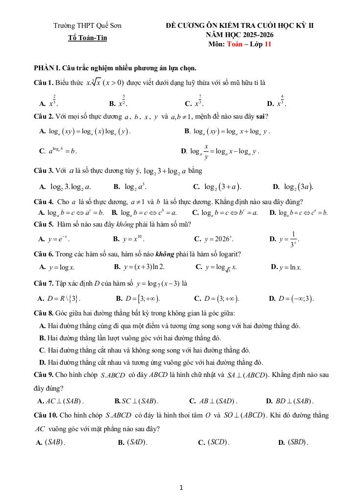 Giải Toán đề cương cuối học kỳ 2 toán 11 năm 2025 – 2026 trường thpt quế sơn – đà nẵng với Đáp Án Mới Nhất