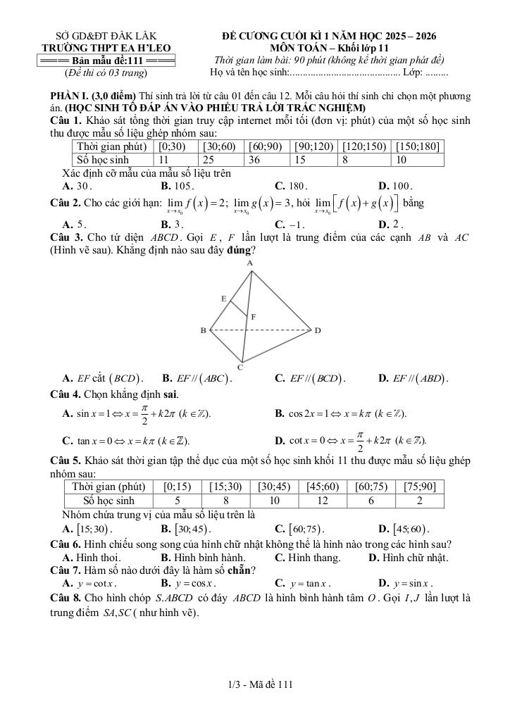 Giải Toán đề cương cuối kì 1 toán 11 năm 2025 – 2026 trường thpt ea h’leo – đắk lắk với Đáp Án Mới Nhất