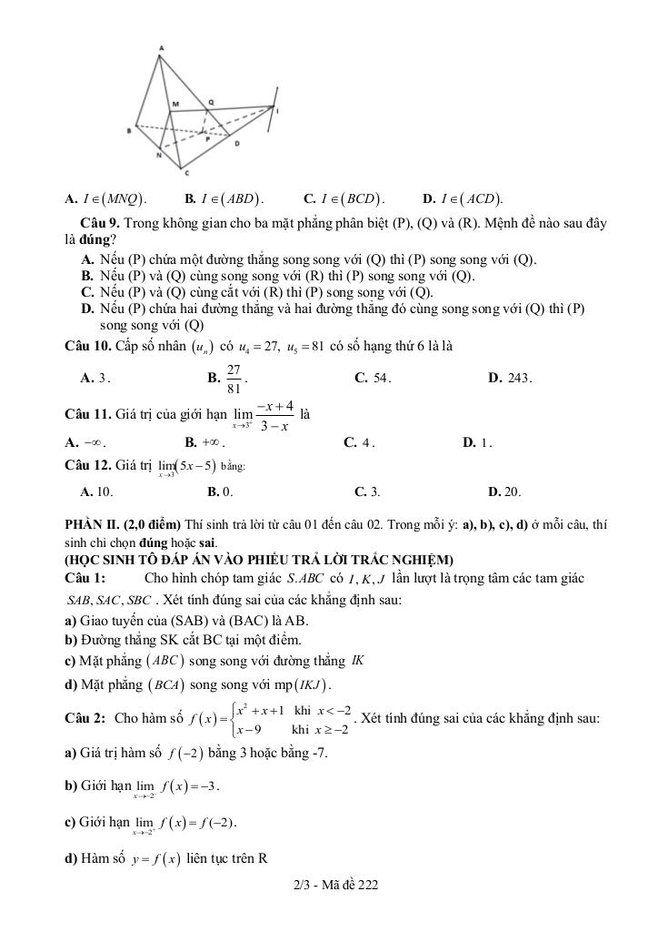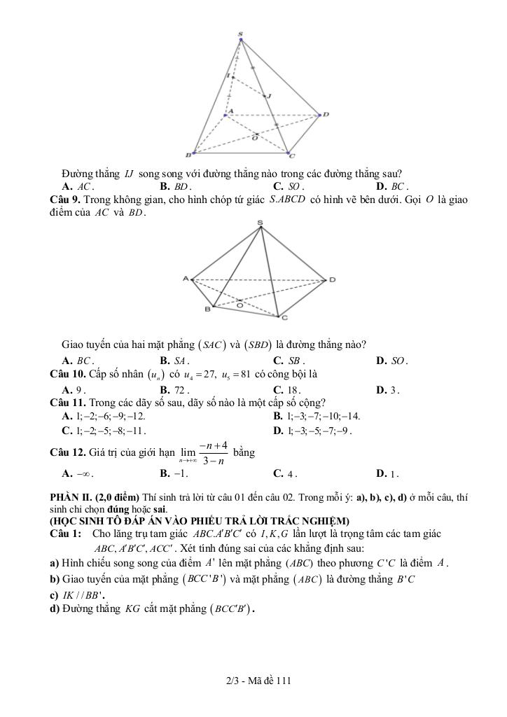 PHẦN I. (3,0 điểm) Thí sinh trả lời từ câu 01 đến câu 12. Mỗi câu hỏi thí sinh chỉ chọn một phương án. (HỌC SINH TÔ ĐÁP ÁN VÀO PHIẾU TRẢ LỜI TRẮC NGHIỆM).
