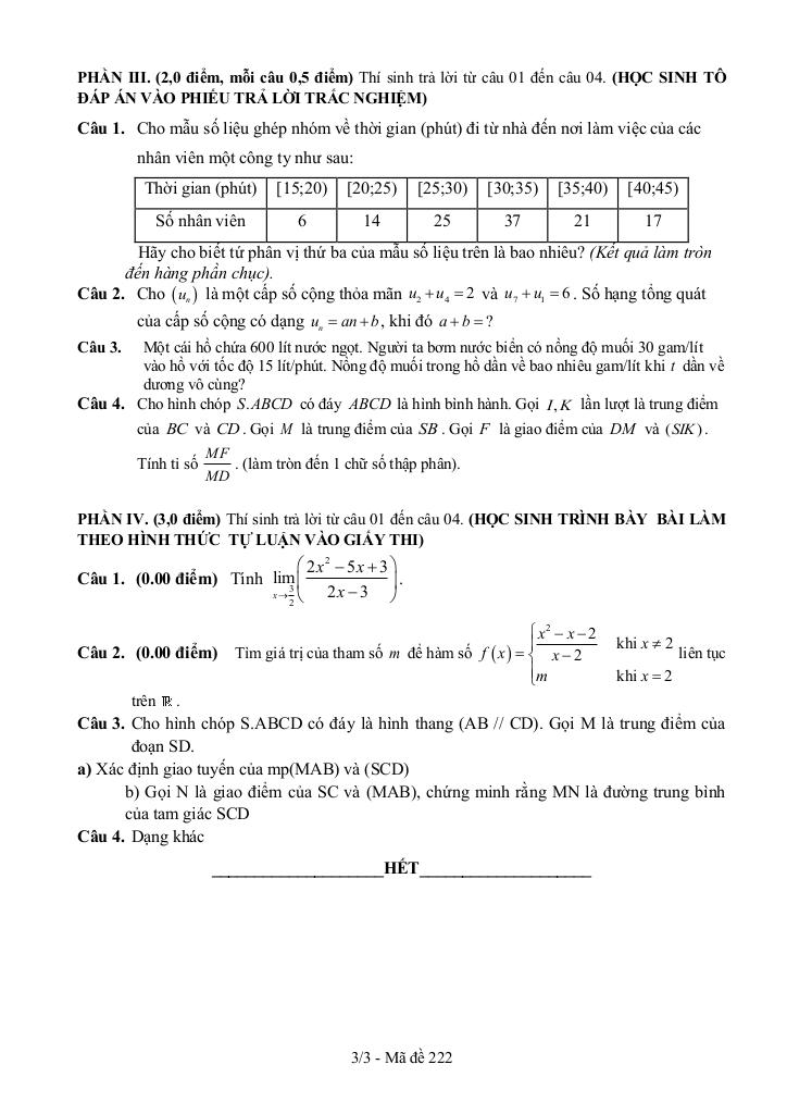 PHẦN III. (2,0 điểm, mỗi câu 0,5 điểm) Thí sinh trả lời từ câu 01 đến câu 04. (HỌC SINH TÔ ĐÁP ÁN VÀO PHIẾU TRẢ LỜI TRẮC NGHIỆM).