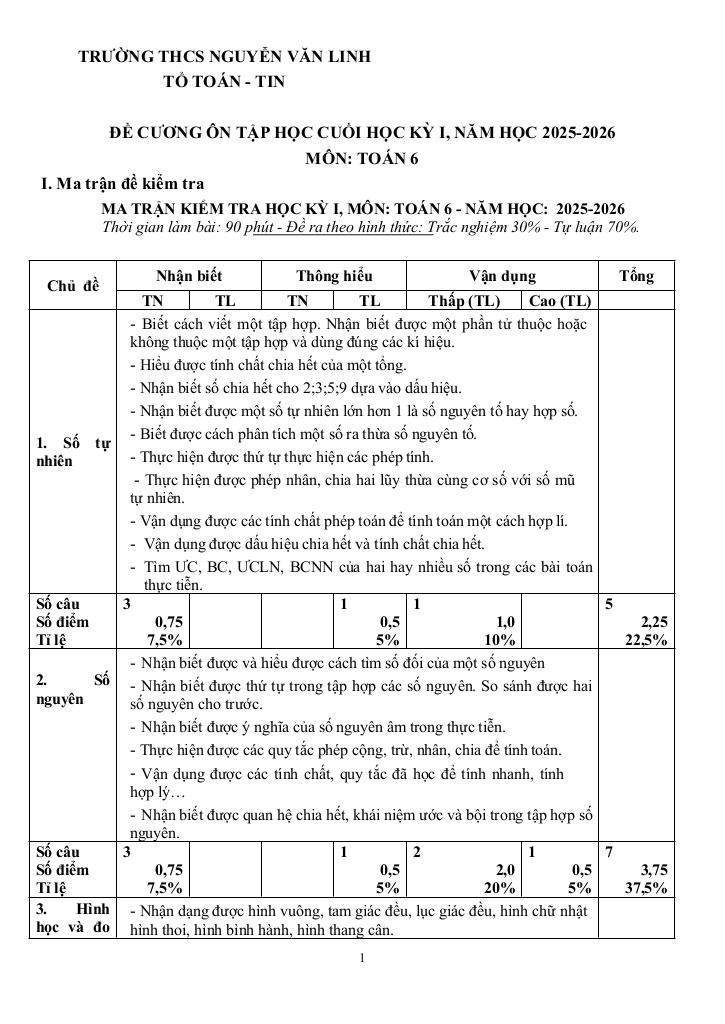 giaitoan.edu.vn giới thiệu đến quý thầy, cô giáo và các em học sinh đề cương ôn thi cuối học kì 1 môn Toán 6 năm học 2025 – 2026 trường THCS Nguyễn Văn Linh, phường Tam Thắng, thành phố Hồ Chí Minh.