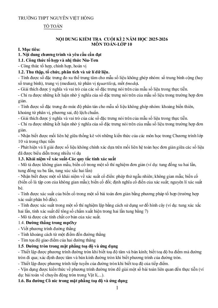 đề cương cuối kì 2 toán 10 năm 2025 – 2026 trường thpt nguyễn việt hồng – cần thơ là một trong những phần kiến thức quan trọng trong chương trình toán học, thường xuất hiện trong các bài kiểm tra và kỳ thi lớn. Việc nắm vững phần này không chỉ giúp bạn đạt điểm cao mà còn tạo nền tảng vững chắc để học các nội dung nâng cao hơn.