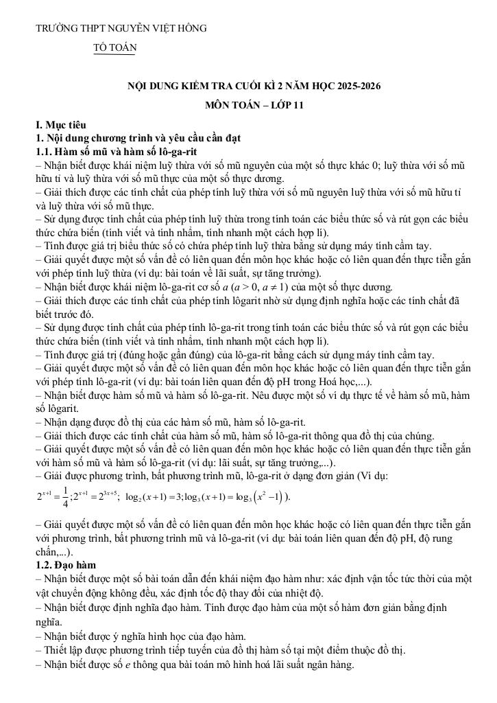 giaitoan.edu.vn giới thiệu đến quý thầy, cô giáo và các em học sinh đề cương ôn tập kiểm tra cuối học kì 2 môn Toán 11 năm học 2025 – 2026 trường THPT Nguyễn Việt Hồng, thành phố Cần Thơ.