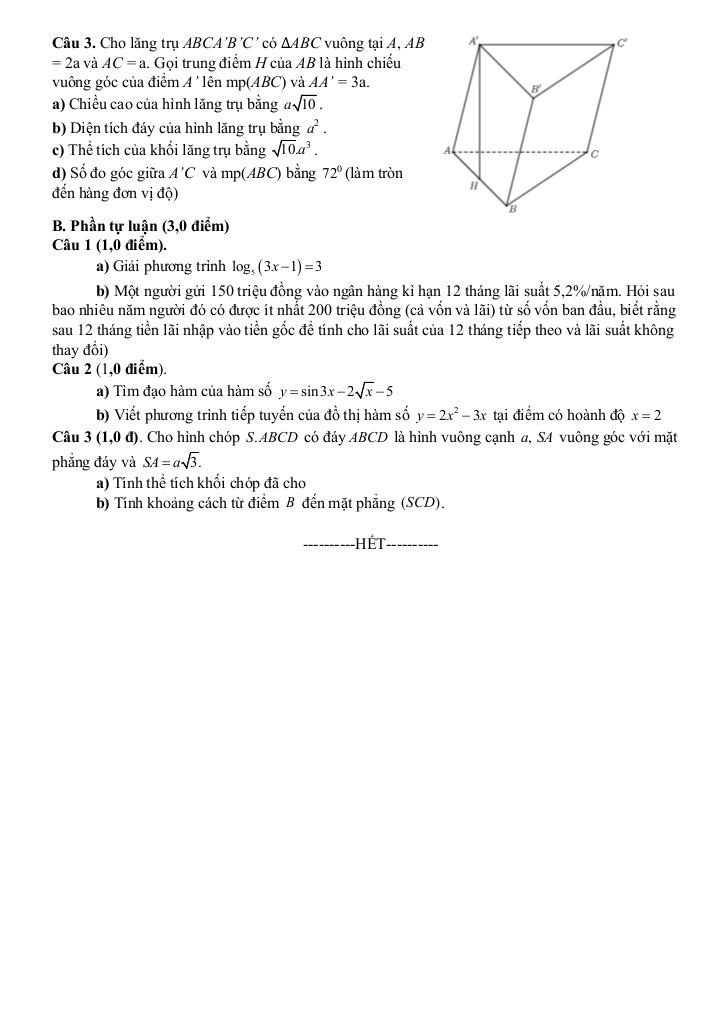 – Tính thể tích của khối lăng trụ.