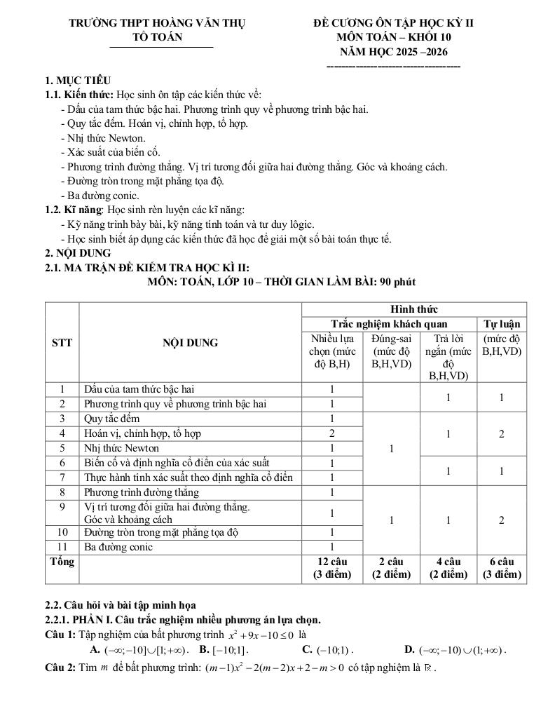 Toán học luôn là một môn học quan trọng, giúp học sinh phát triển tư duy logic và kỹ năng giải quyết vấn đề. Để hỗ trợ các bạn học sinh và giáo viên trong việc học tập và giảng dạy, bài viết này sẽ cung cấp lời giải chi tiết và đáp án chính xác cho chủ đề đề cương cuối kỳ 2 toán 10 năm 2025 – 2026 trường thpt hoàng văn thụ – hà nội, giúp bạn hiểu sâu và tự tin hơn khi làm bài tập.