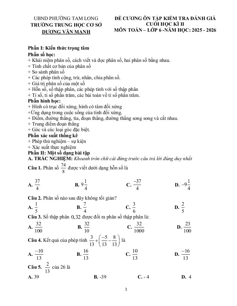 Toán học luôn là một môn học quan trọng, giúp học sinh phát triển tư duy logic và kỹ năng giải quyết vấn đề. Để hỗ trợ các bạn học sinh và giáo viên trong việc học tập và giảng dạy, bài viết này sẽ cung cấp lời giải chi tiết và đáp án chính xác cho chủ đề đề cương cuối kỳ 2 toán 6 năm 2025 – 2026 trường thcs dương văn mạnh – tp hcm, giúp bạn hiểu sâu và tự tin hơn khi làm bài tập.