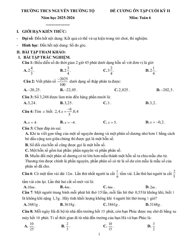 giaitoan.edu.vn giới thiệu đến quý thầy, cô giáo và các em học sinh đề cương ôn tập cuối học kỳ 2 môn Toán 6 năm học 2025 – 2026 trường THCS Nguyễn Trường Tộ, thành phố Hà Nội.