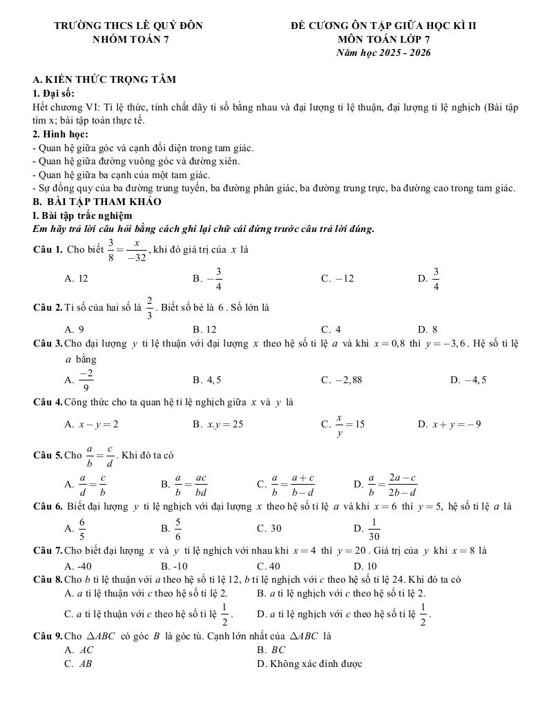 giaitoan.edu.vn giới thiệu đến quý thầy, cô giáo và các em học sinh đề cương ôn tập giữa học kì 2 môn Toán 7 năm học 2025 – 2026 trường THCS Lê Quý Đôn, thành phố Hà Nội.