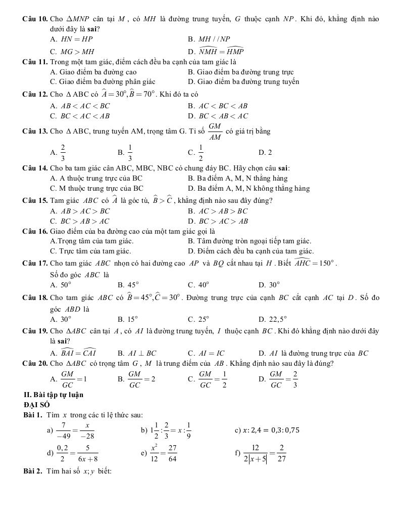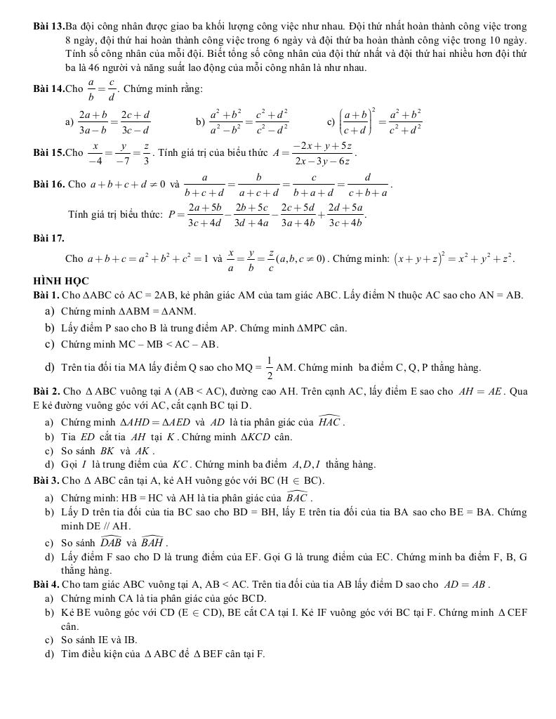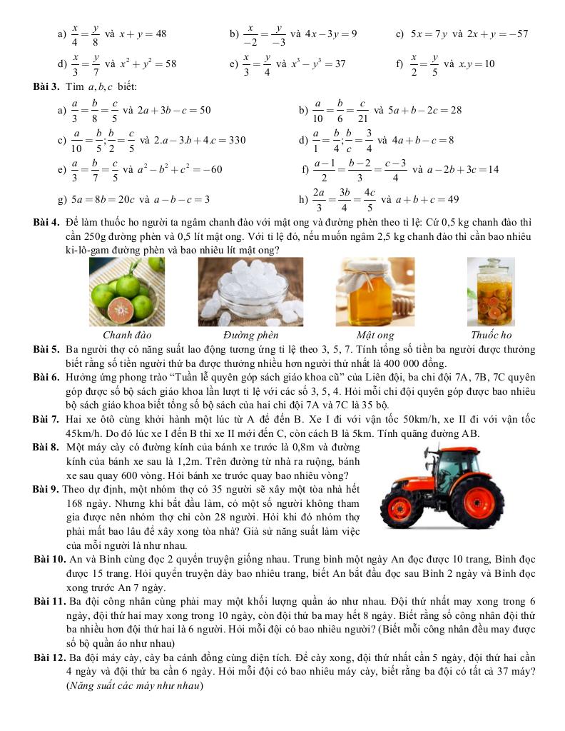 Hết chương VI: Tỉ lệ thức, tính chất dãy tỉ số bằng nhau và đại lượng tỉ lệ thuận, đại lượng tỉ lệ nghịch (bài tập tìm x; bài tập toán thực tế).