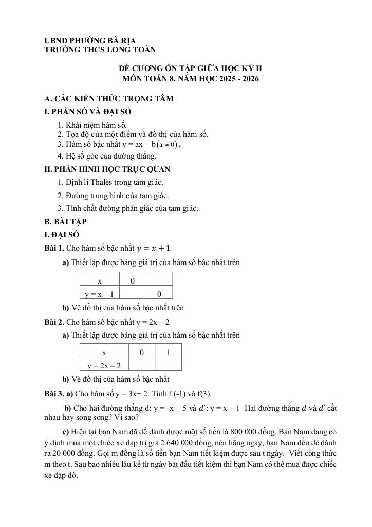 giaitoan.edu.vn giới thiệu đến quý thầy, cô giáo và các em học sinh đề cương ôn tập giữa học kì 2 môn Toán 8 năm học 2025 – 2026 trường THCS Long Toàn, phường Bà Rịa, thành phố Hồ Chí Minh.