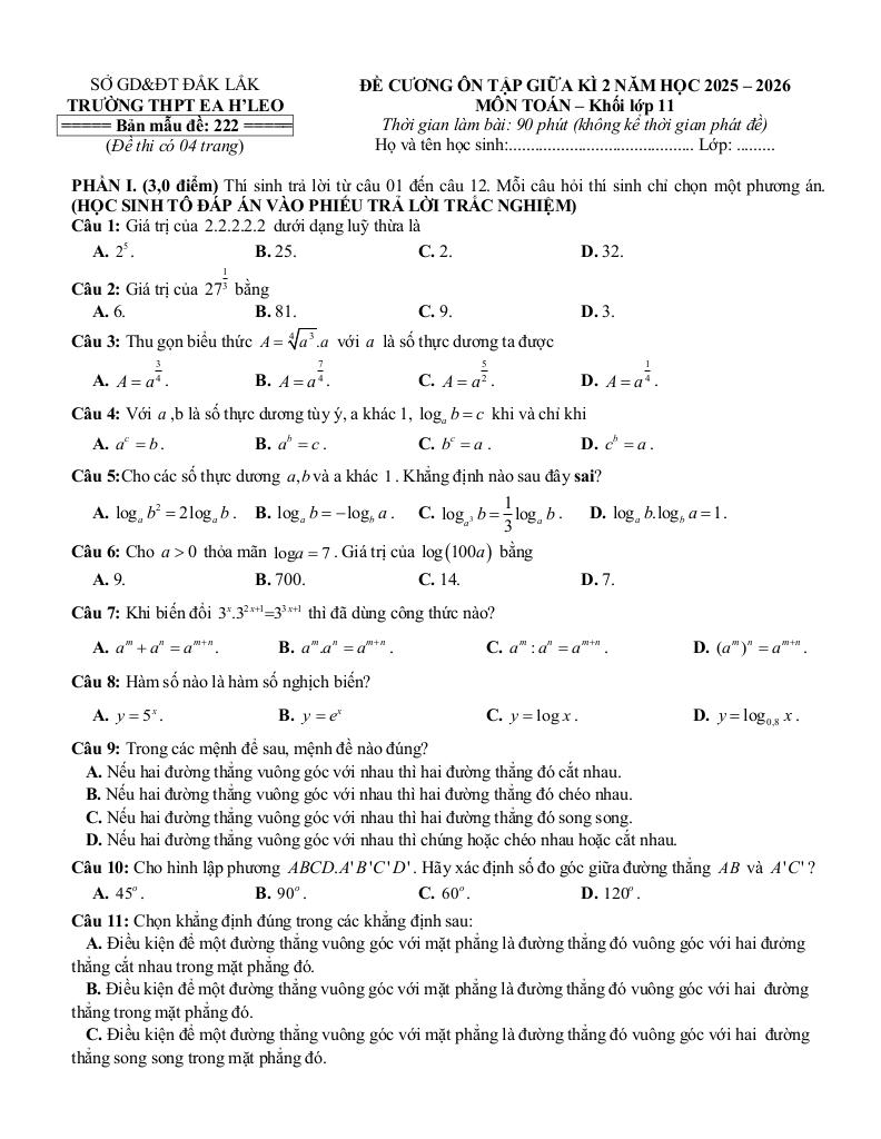 đề cương giữa kì 2 toán 11 năm 2025 – 2026 trường thpt ea h’leo – đắk lắk – hành trang không thể thiếu trong chuyên mục