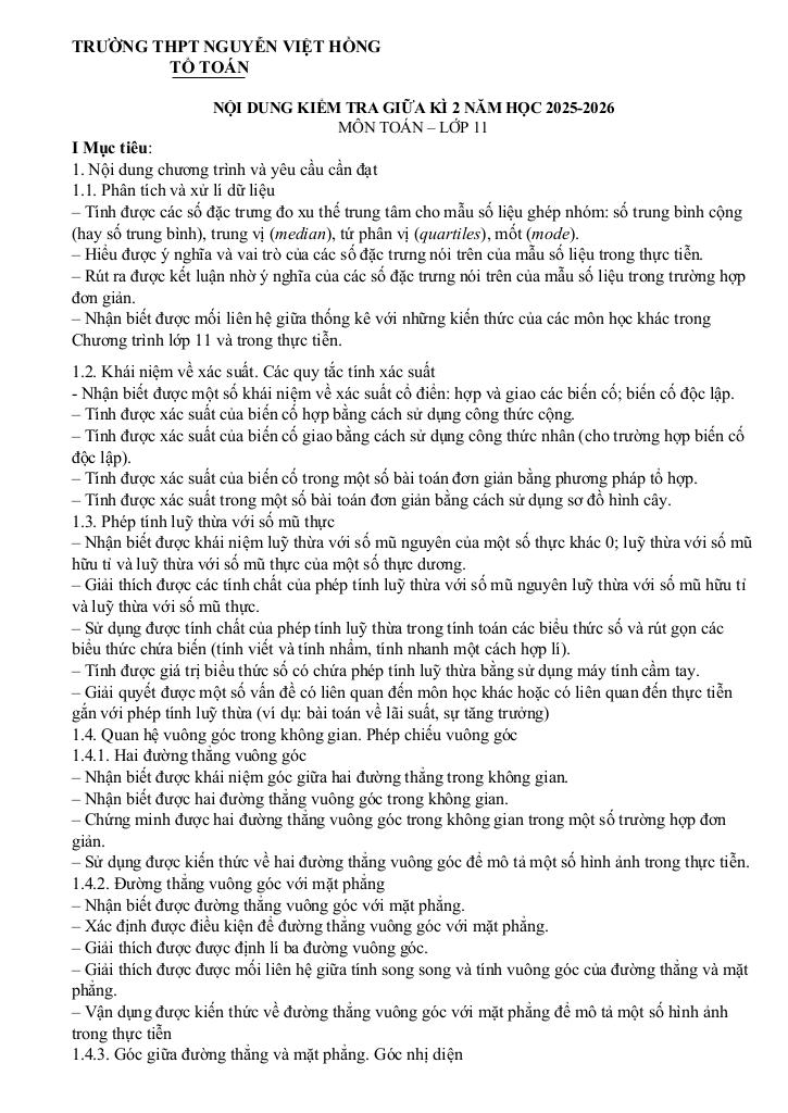 giaitoan.edu.vn giới thiệu đến quý thầy, cô giáo và các em học sinh đề cương ôn tập kiểm tra giữa học kì 2 môn Toán 11 năm học 2025 – 2026 trường THPT Nguyễn Việt Hồng, thành phố Cần Thơ.
