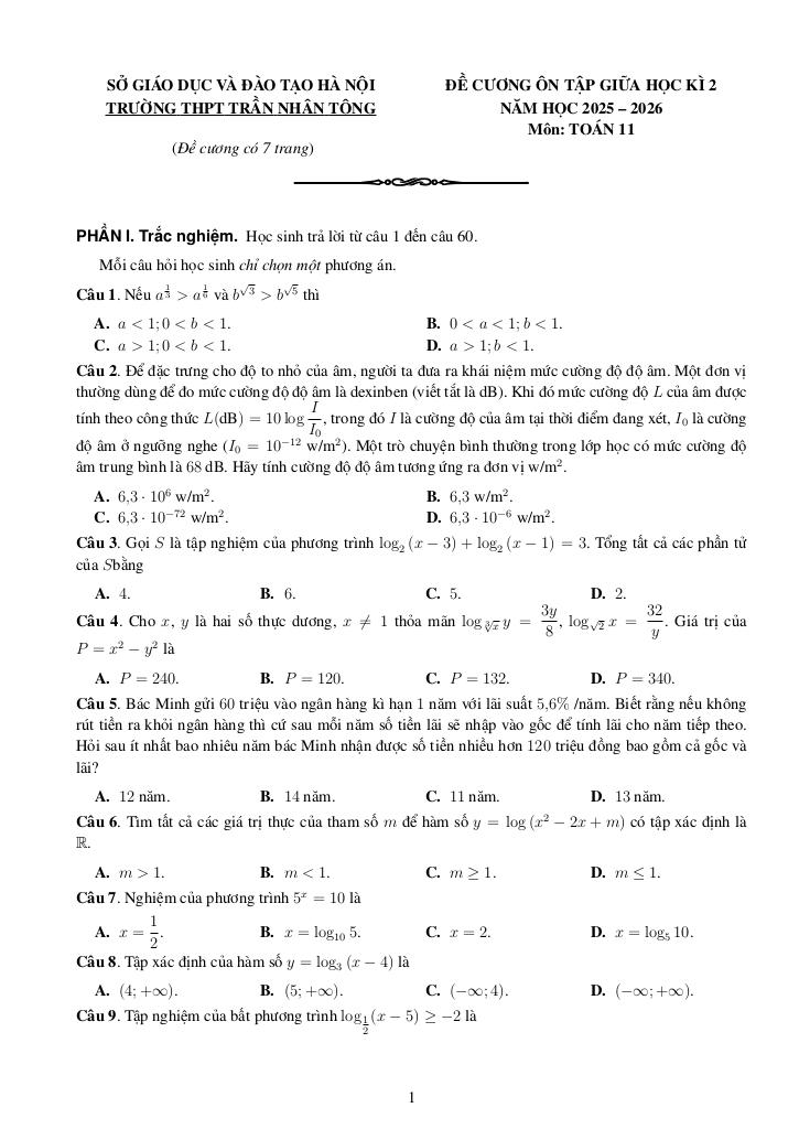 Toán học luôn là một môn học quan trọng, giúp học sinh phát triển tư duy logic và kỹ năng giải quyết vấn đề. Để hỗ trợ các bạn học sinh và giáo viên trong việc học tập và giảng dạy, bài viết này sẽ cung cấp lời giải chi tiết và đáp án chính xác cho chủ đề đề cương giữa kì 2 toán 11 năm 2025 – 2026 trường thpt trần nhân tông – hà nội, giúp bạn hiểu sâu và tự tin hơn khi làm bài tập.