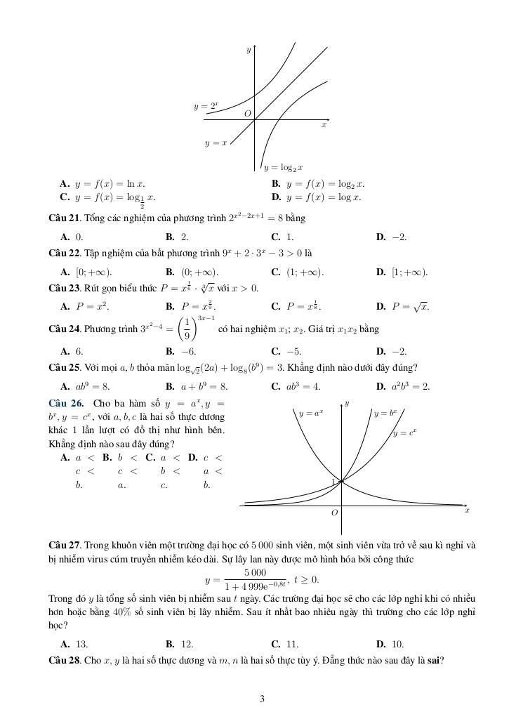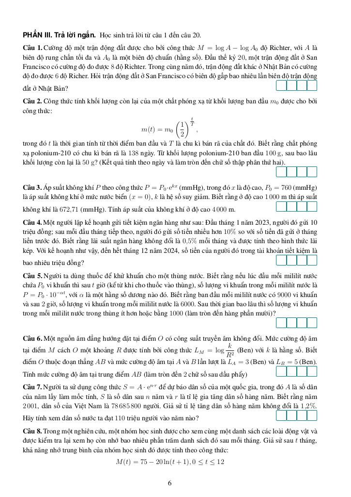 + Phần III. Trả lời ngắn. Học sinh trả lời từ câu 1 đến câu 20.