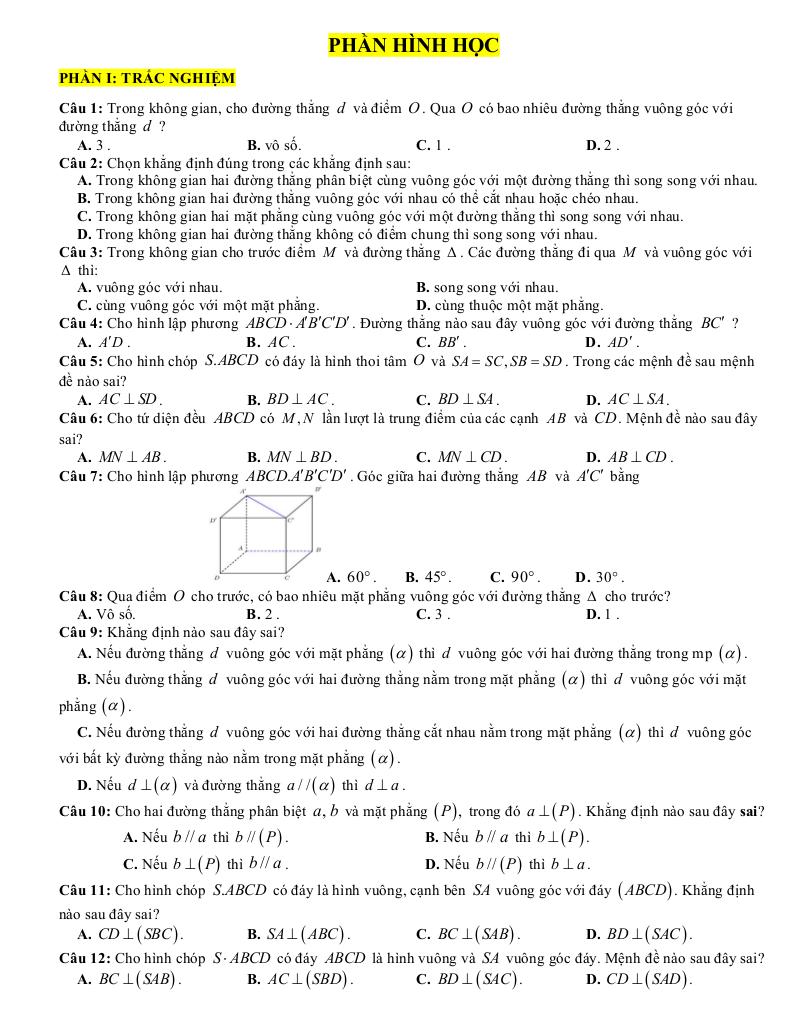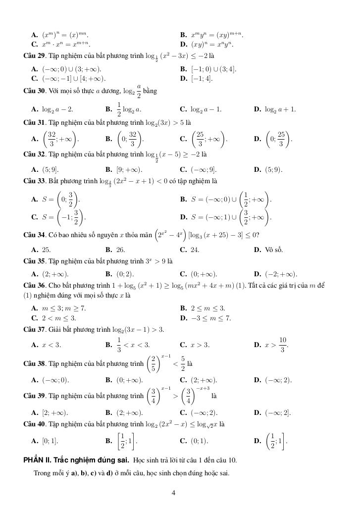 + Phần I. Trắc nghiệm. Học sinh trả lời từ câu 1 đến câu 40. Mỗi câu hỏi học sinh chỉ chọn một phương án.