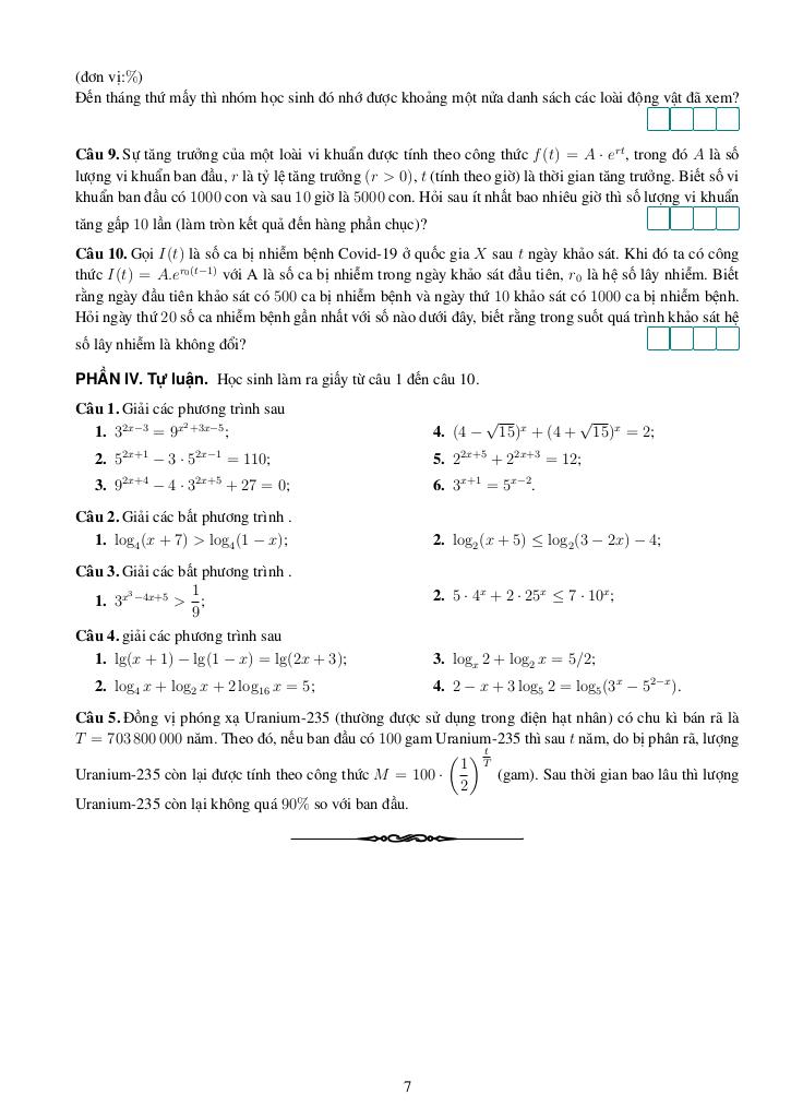 + Phần IV. Tự luận. Học sinh làm ra giấy từ câu 1 đến câu 10.