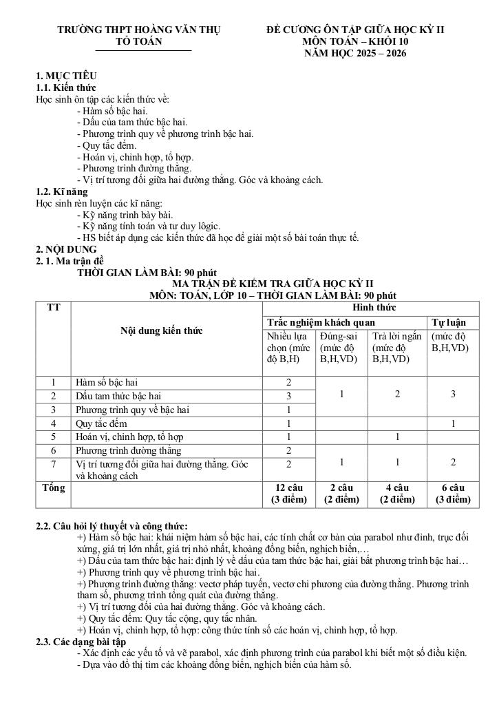 giaitoan.edu.vn giới thiệu đến quý thầy, cô giáo và các em học sinh đề cương ôn tập giữa học kỳ 2 môn Toán 10 năm học 2025 – 2026 trường THPT Hoàng Văn Thụ, thành phố Hà Nội.