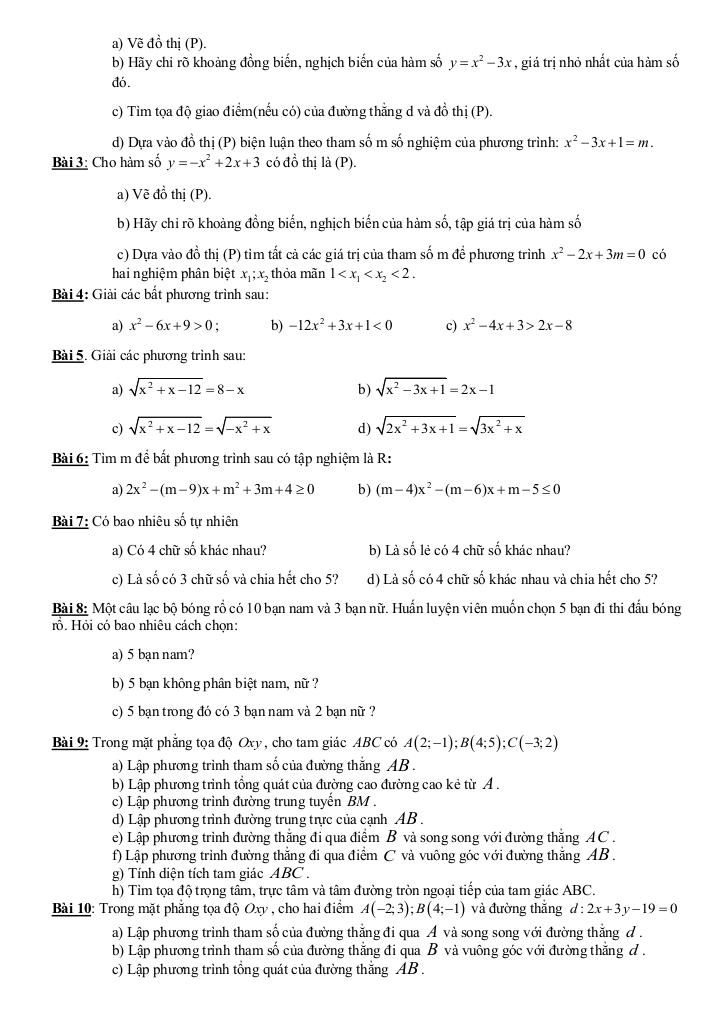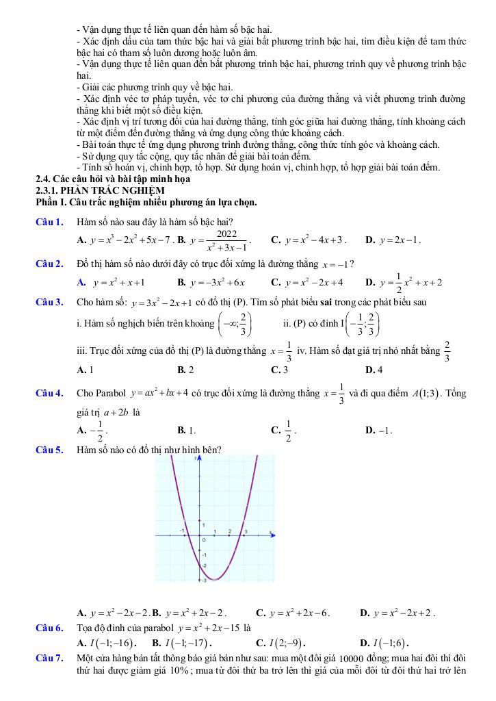 + Hàm số bậc hai: khái niệm hàm số bậc hai, các tính chất cơ bản của parabol như đỉnh, trục đối xứng, giá trị lớn nhất, giá trị nhỏ nhất, khoảng đồng biến, nghịch biến.