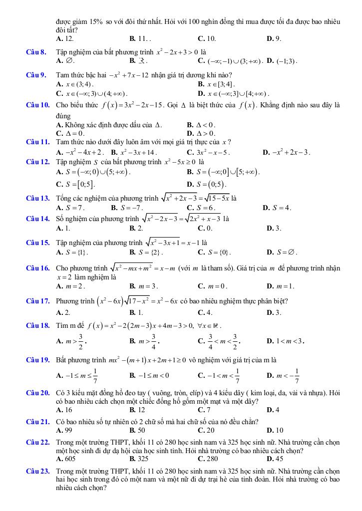 + Dấu của tam thức bậc hai: định lý về dấu của tam thức bậc hai, giải bất phương trình bậc hai.