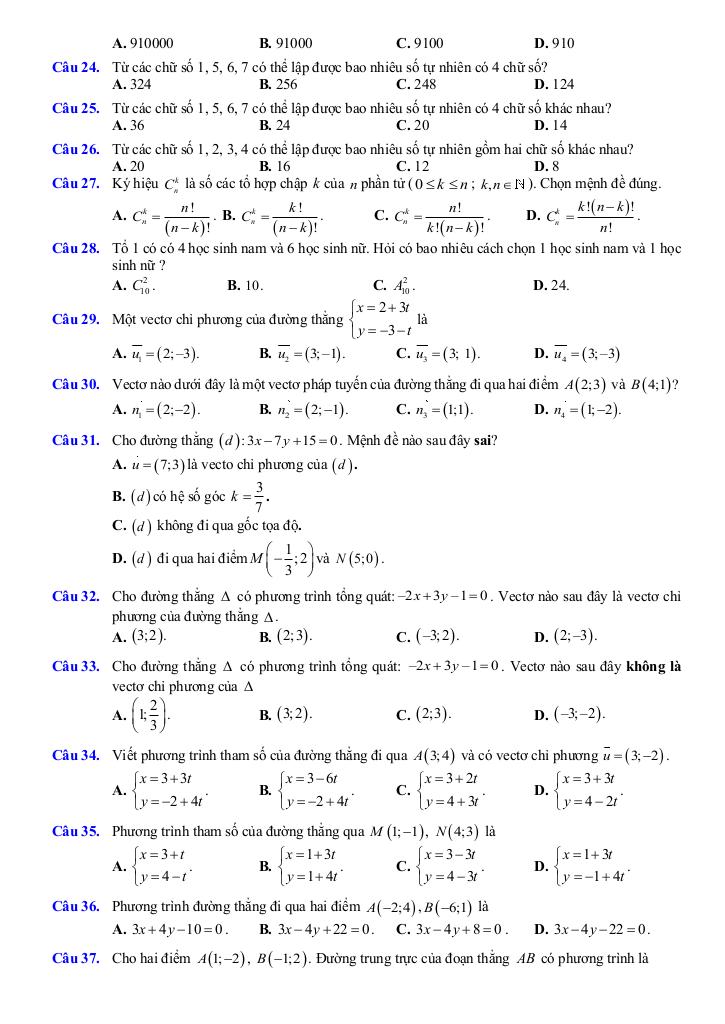 + Phương trình đường thẳng: vectơ pháp tuyến, vectơ chỉ phương của đường thẳng. Phương trình tham số, phương trình tổng quát của đường thẳng.