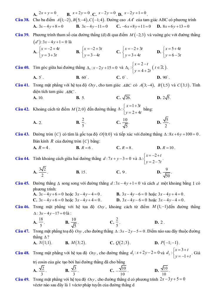 – Xác định vị trí tương đối của hai đường thẳng, tính góc giữa hai đường thẳng, tính khoảng cách từ một điểm đến đường thẳng và ứng dụng công thức khoảng cách.