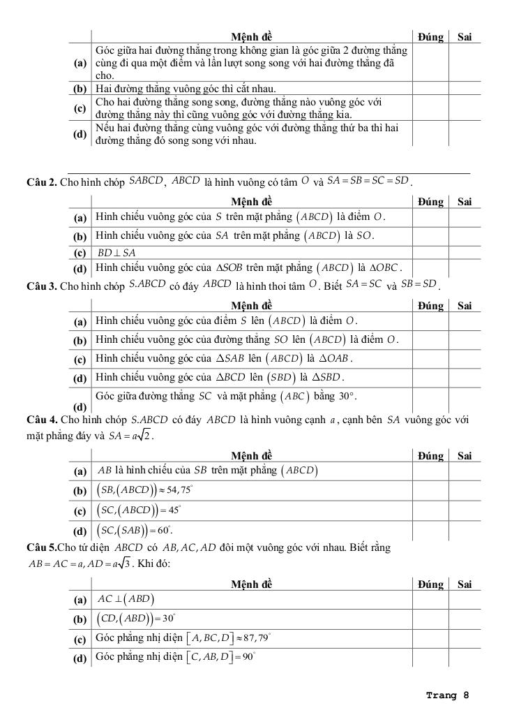 Chương VIII: Quan hệ vuông góc trong không gian. Phép chiếu vuông góc.