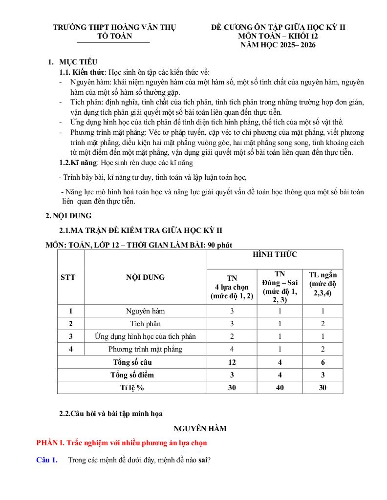 giaitoan.edu.vn giới thiệu đến quý thầy, cô giáo và các em học sinh đề cương ôn tập giữa học kỳ 2 môn Toán 12 năm học 2025 – 2026 trường THPT Hoàng Văn Thụ, thành phố Hà Nội.
