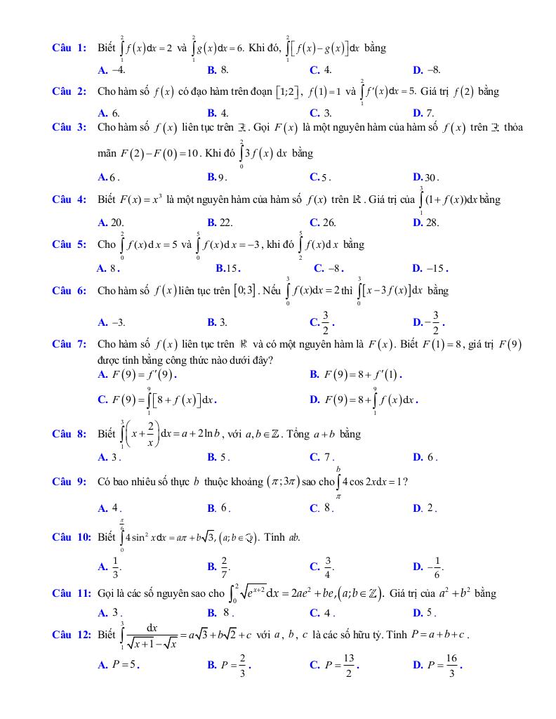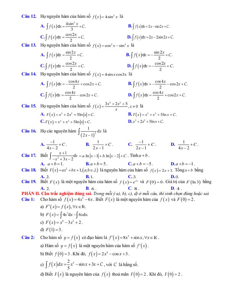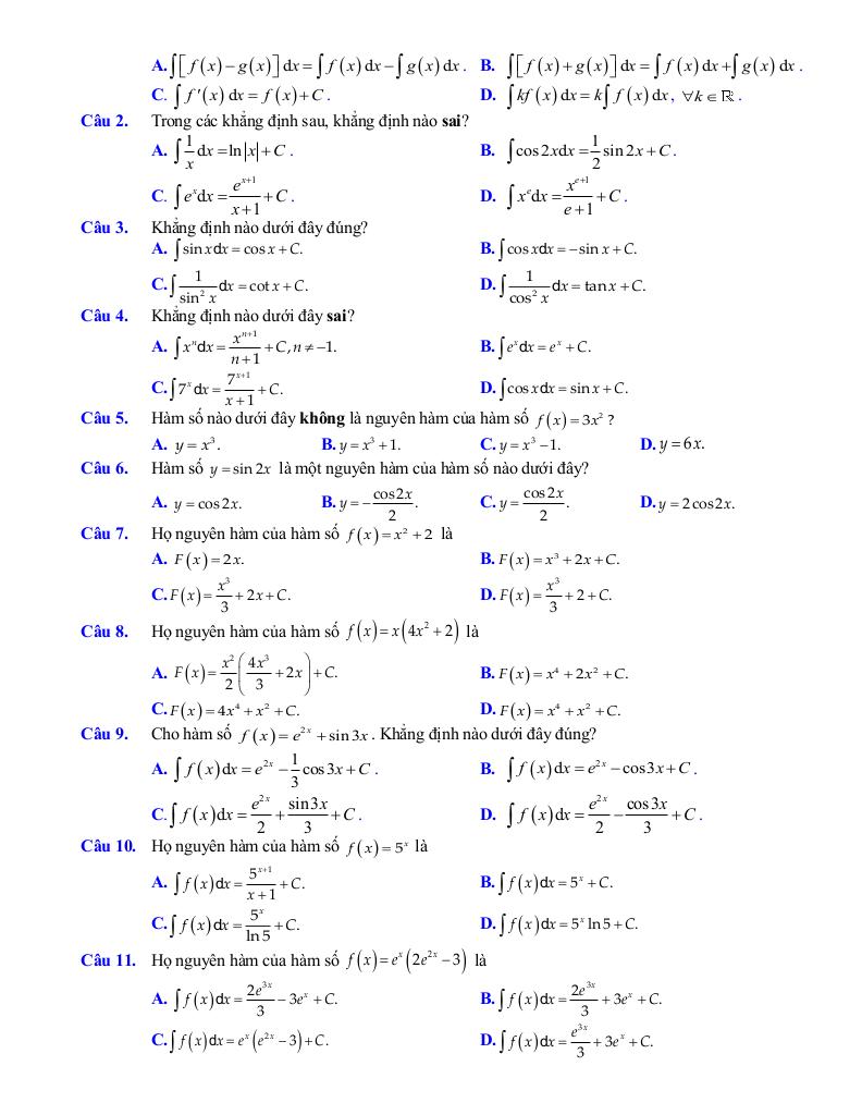 – Nguyên hàm: khái niệm nguyên hàm của một hàm số, một số tính chất của nguyên hàm, nguyên hàm của một số hàm số thường gặp.