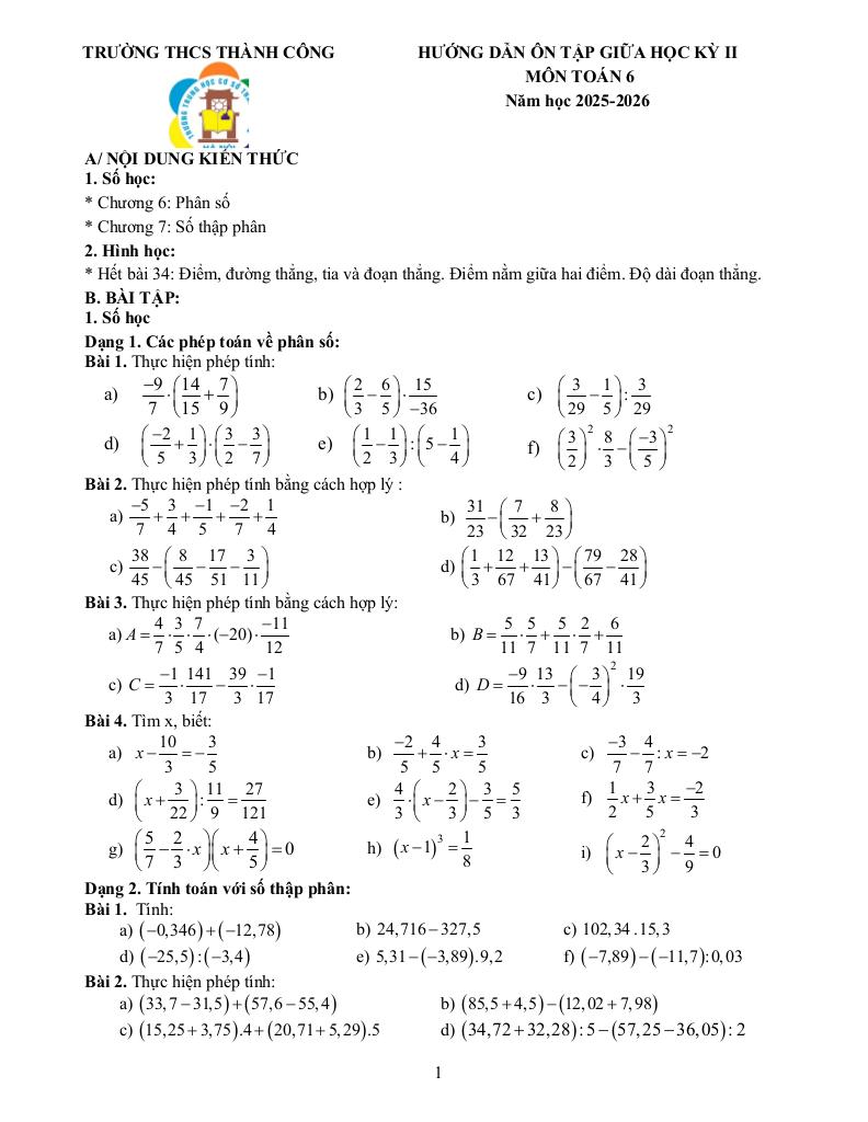 giaitoan.edu.vn giới thiệu đến quý thầy, cô giáo và các em học sinh đề cương ôn tập kiểm tra giữa học kỳ 2 môn Toán 6 năm học 2025 – 2026 trường THCS Thành Công, phường Giảng Võ, thành phố Hà Nội.