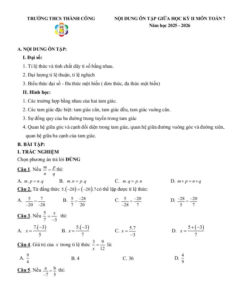 giaitoan.edu.vn giới thiệu đến quý thầy, cô giáo và các em học sinh đề cương ôn tập kiểm tra giữa học kỳ 2 môn Toán 7 năm học 2025 – 2026 trường THCS Thành Công, phường Giảng Võ, thành phố Hà Nội.