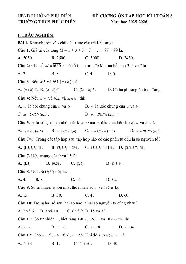 Toán học luôn là một môn học quan trọng, giúp học sinh phát triển tư duy logic và kỹ năng giải quyết vấn đề. Để hỗ trợ các bạn học sinh và giáo viên trong việc học tập và giảng dạy, bài viết này sẽ cung cấp lời giải chi tiết và đáp án chính xác cho chủ đề đề cương học kì 1 toán 6 năm 2025 – 2026 trường thcs phúc diễn – hà nội, giúp bạn hiểu sâu và tự tin hơn khi làm bài tập.