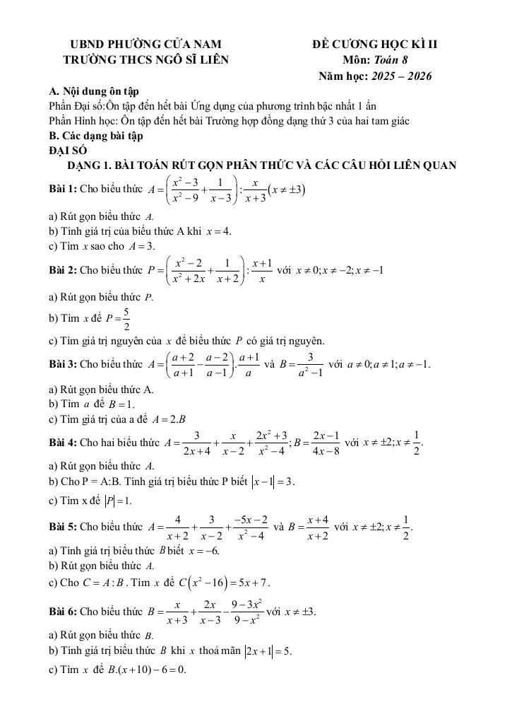 giaitoan.edu.vn giới thiệu đến quý thầy, cô giáo và các em học sinh đề cương ôn tập cuối học kì 2 môn Toán 8 năm học 2025 – 2026 trường THCS Ngô Sĩ Liên, phường Cửa Nam, thành phố Hà Nội.
