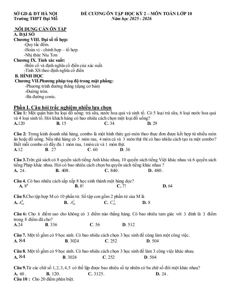 Giải Toán đề cương học kỳ 2 toán 10 năm 2025 – 2026 trường thpt đại mỗ – hà nội với Đáp Án Mới Nhất