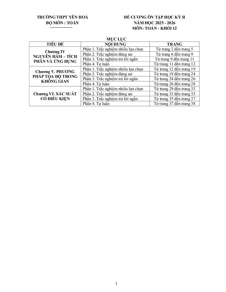 Toán học luôn là một môn học quan trọng, giúp học sinh phát triển tư duy logic và kỹ năng giải quyết vấn đề. Để hỗ trợ các bạn học sinh và giáo viên trong việc học tập và giảng dạy, bài viết này sẽ cung cấp lời giải chi tiết và đáp án chính xác cho chủ đề đề cương học kỳ 2 toán 12 năm 2025 – 2026 trường thpt yên hòa – hà nội, giúp bạn hiểu sâu và tự tin hơn khi làm bài tập.