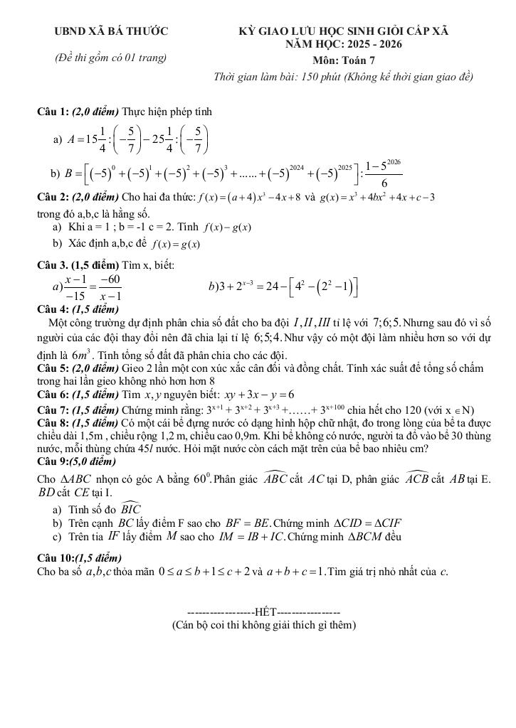 Trích dẫn Đề giao lưu HSG Toán 7 năm 2025 – 2026 xã Bá Thước – Thanh Hóa: