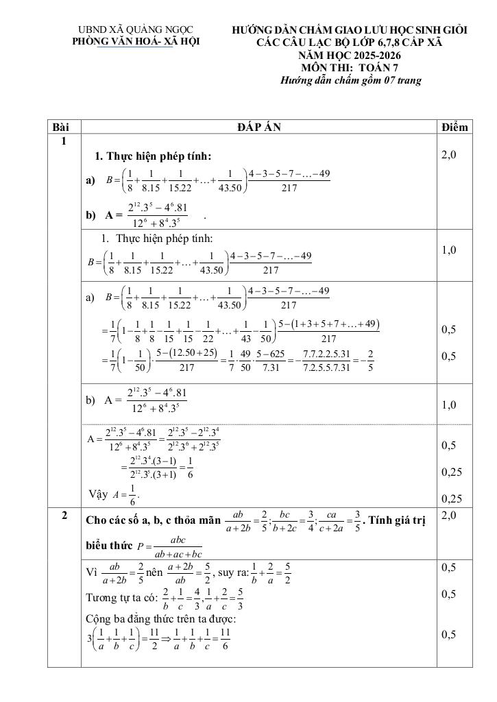 Giải Toán đề giao lưu hsg toán 7 năm 2025 – 2026 xã quảng ngọc – thanh hóa với Đáp Án Mới Nhất
