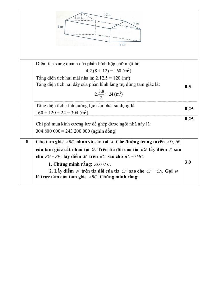+ Người ta làm một nhà kính trồng cây thí nghiệm gồm 2 phần, phần dưới là một hình hộp chữ nhật có kích thước 4 m, 8m, 12m và phần trên là một lăng trụ đứng có đáy tam giác cân với cạnh bên 5m, chiều cao ứng với cạnh đáy dài 3m được ghép hoàn toàn bằng kính cường lực. Biết rằng mỗi mét vuông kính cường lực có giá 800 nghìn đồng. Tính chi phí mua cường lực để ghép được ngôi nhà này (giả sử các chỗ ghép nối không đáng kể).