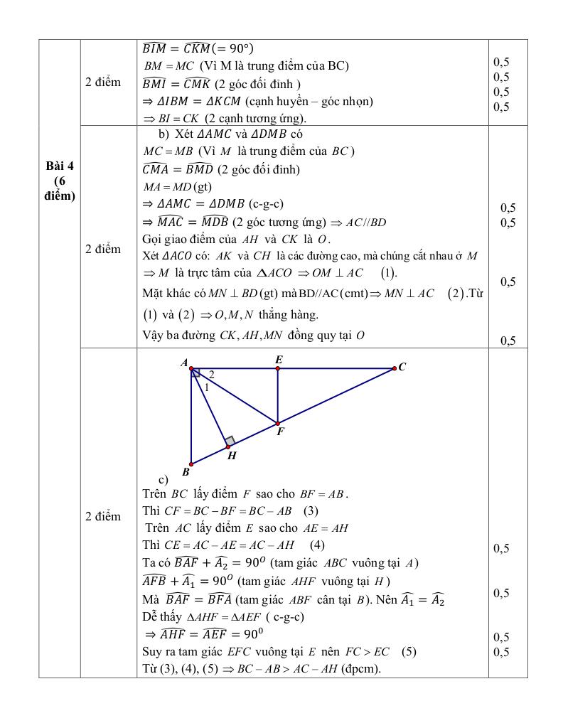 + Cho ∆ABC vuông tại A (AB < AC). Gọi M là trung điểm của cạnh BC, lấy điểm D thuộc tia đối của tia MA sao cho MD = MA. Kẻ BI vuông góc với AD tại I, CK vuông góc với AD tại K. a) Chứng minh rằng BI = CK. b) Kẻ AH vuông góc với BC tại H, MN vuông góc với BD tại N. Chứng minh rằng các đường thẳng CK, AH, MN đồng quy. c) Chứng minh rằng BC – AB /> AC – AH.