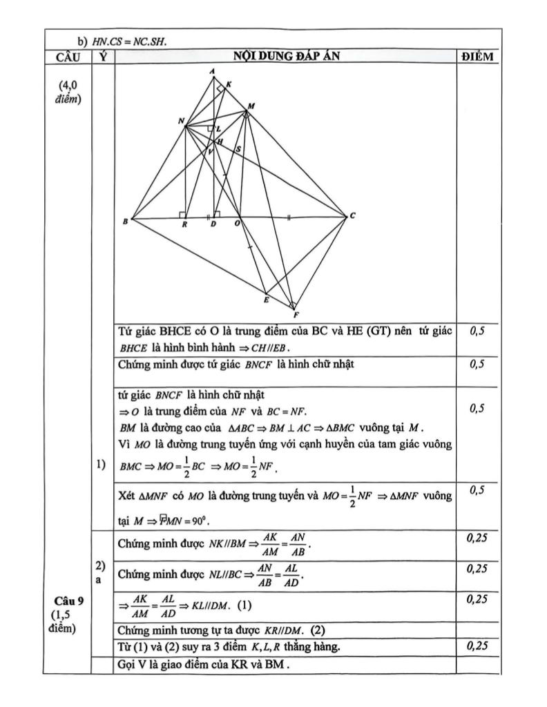 + Cho tam giác ABC nhọn (AB < AC). Các đường cao AD, BM, CN của tam giác ABC cắt nhau tại H. Gọi O là trung điểm của đoạn thẳng BC, trên tia đối của tia OH lấy điểm E sao cho OH = OE. Kẻ CF vuông góc với đường thẳng BE tại F. 1) Chứng minh tứ giác BNCF là hình chữ nhật và góc NMF = 90°. 2) Gọi K, L, R lần lượt là chân các đường vuông góc kẻ từ N đến các đường thẳng AC, AD, BC. Gọi giao điểm của DM và CN là S. Chứng minh rằng: a) KL // MD và ba điểm K, L, R thẳng hàng. b) giaitoan.edu.vn = giaitoan.edu.vn.