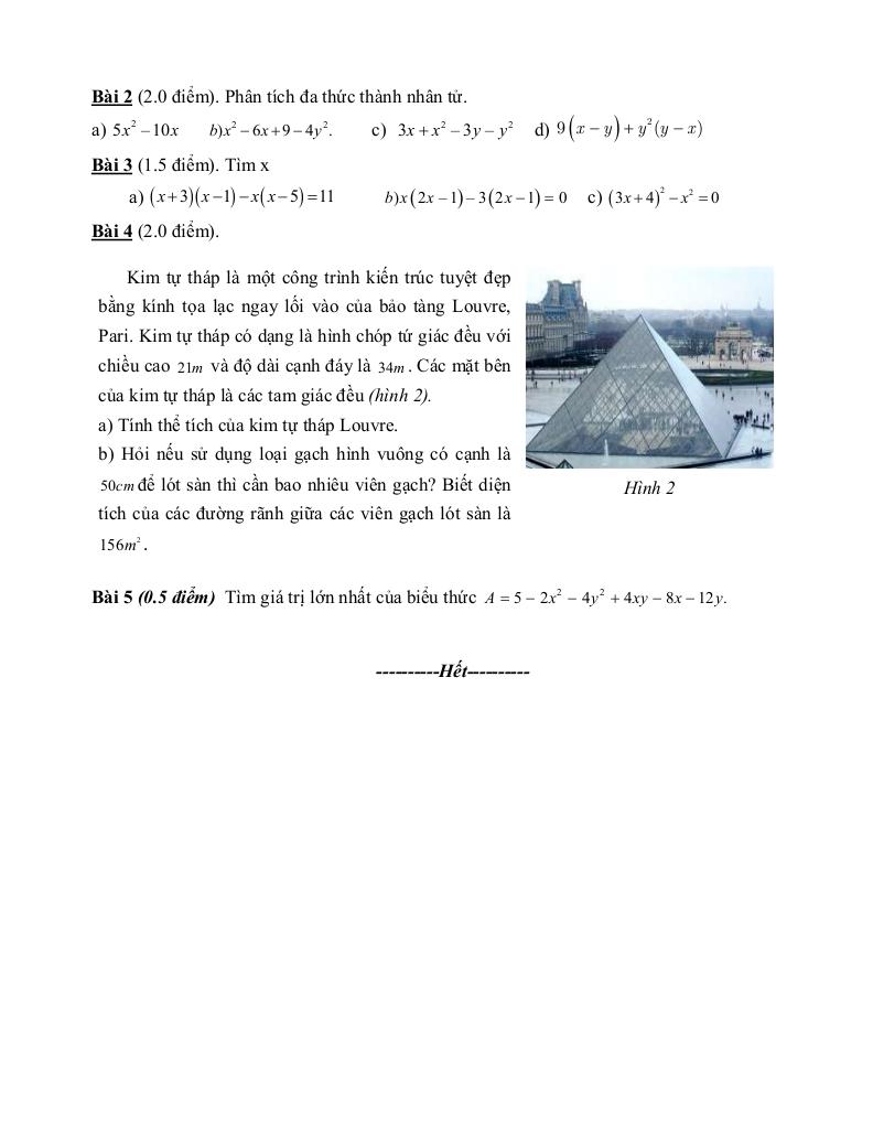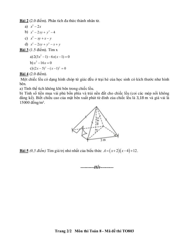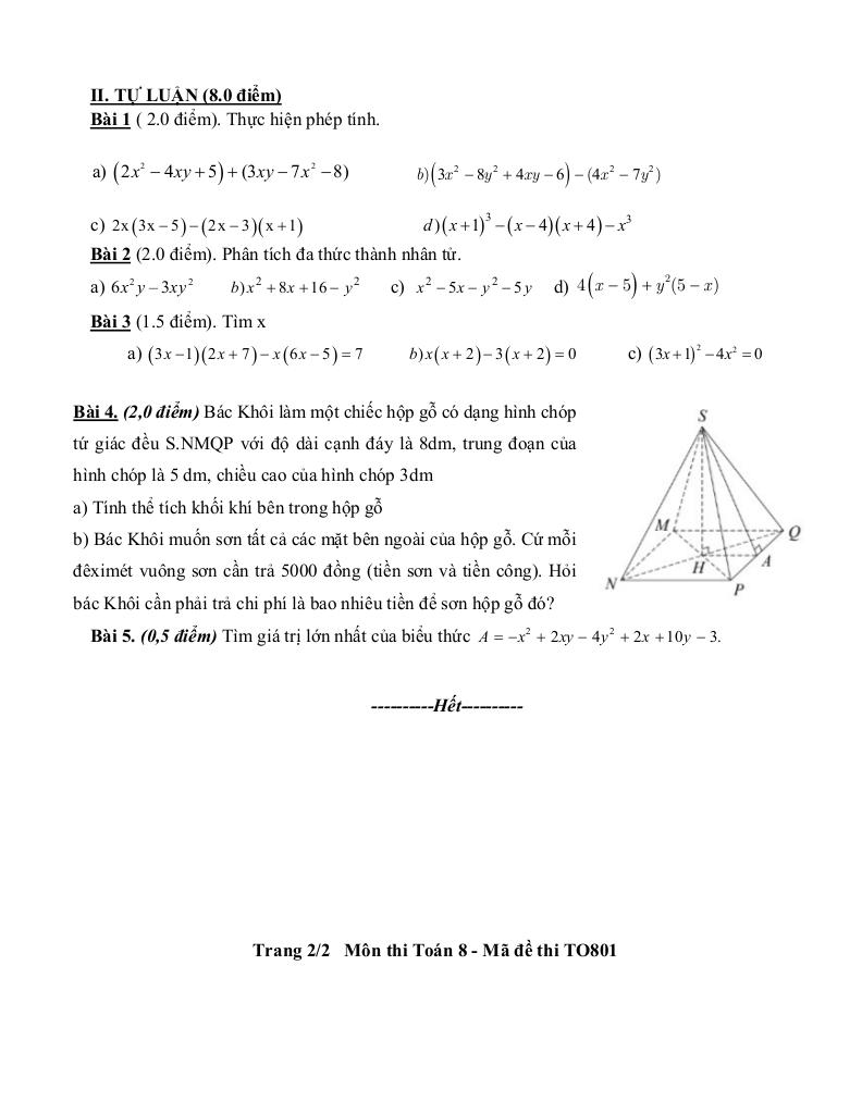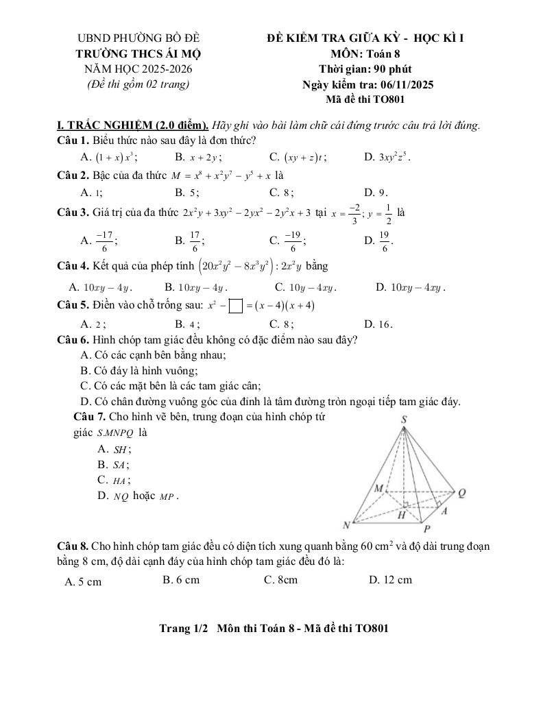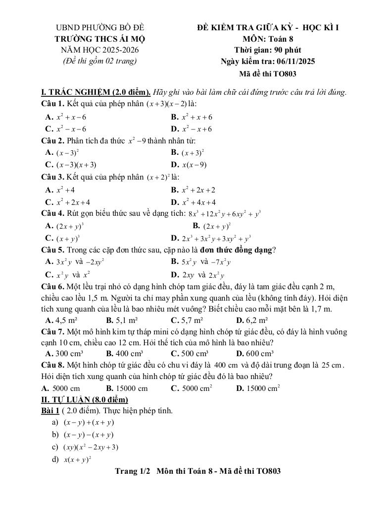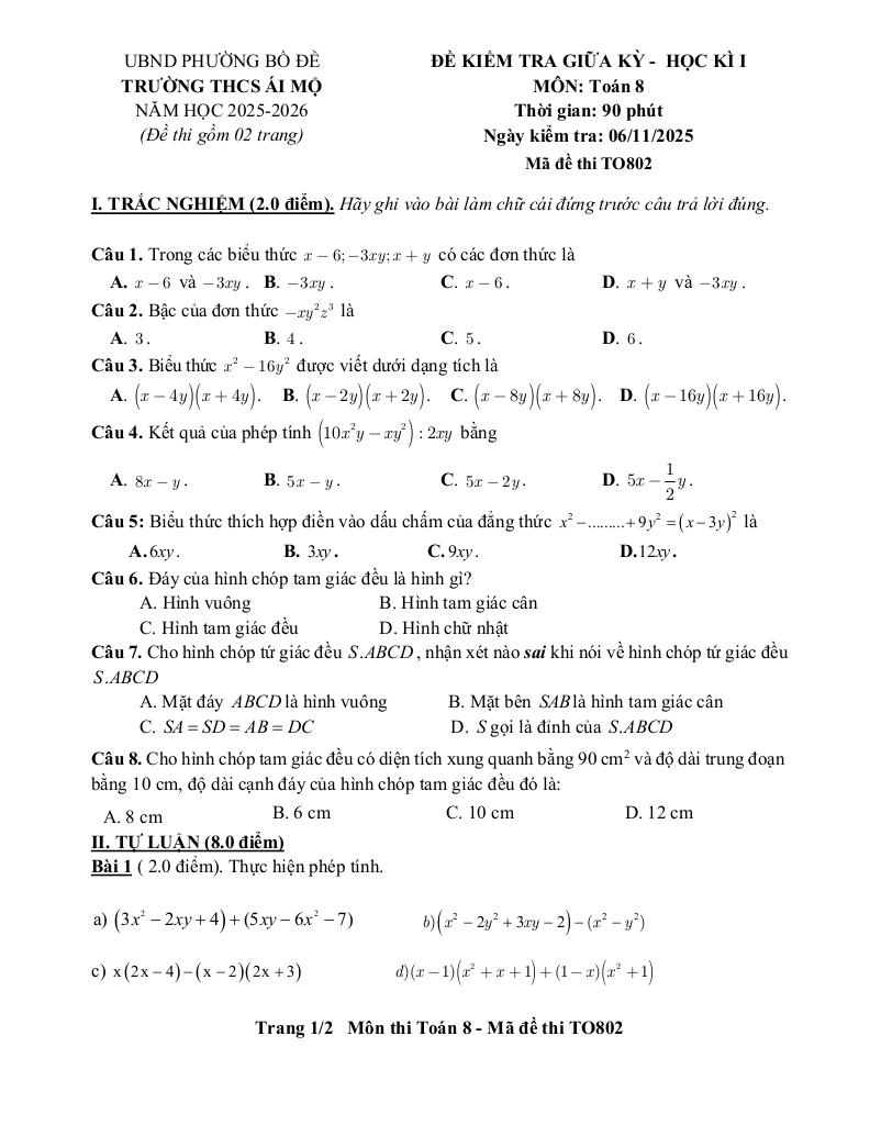 Trích dẫn Đề giữa học kì 1 Toán 8 năm 2025 – 2026 trường THCS Ái Mộ – Hà Nội: