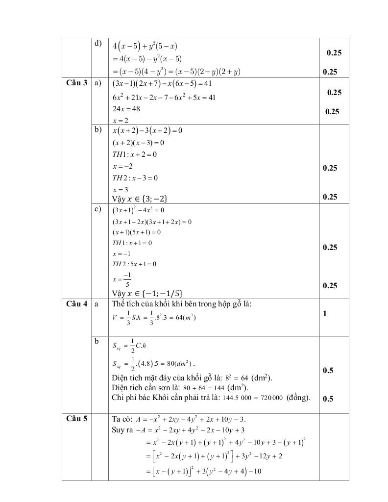 + Bác Khôi làm một chiếc hộp gỗ có dạng hình chóp tứ giác đều giaitoan.edu.vn với độ dài cạnh đáy là 8dm, trung đoạn của hình chóp là 5 dm, chiều cao của hình chóp 3dm a) Tính thể tích khối khí bên trong hộp gỗ b) Bác Khôi muốn sơn tất cả các mặt bên ngoài của hộp gỗ. Cứ mỗi đêximét vuông sơn cần trả 5000 đồng (tiền sơn và tiền công). Hỏi bác Khôi cần phải trả chi phí là bao nhiêu tiền để sơn hộp gỗ đó?
