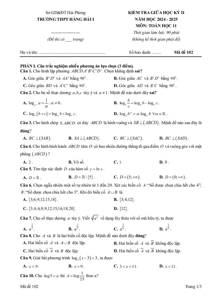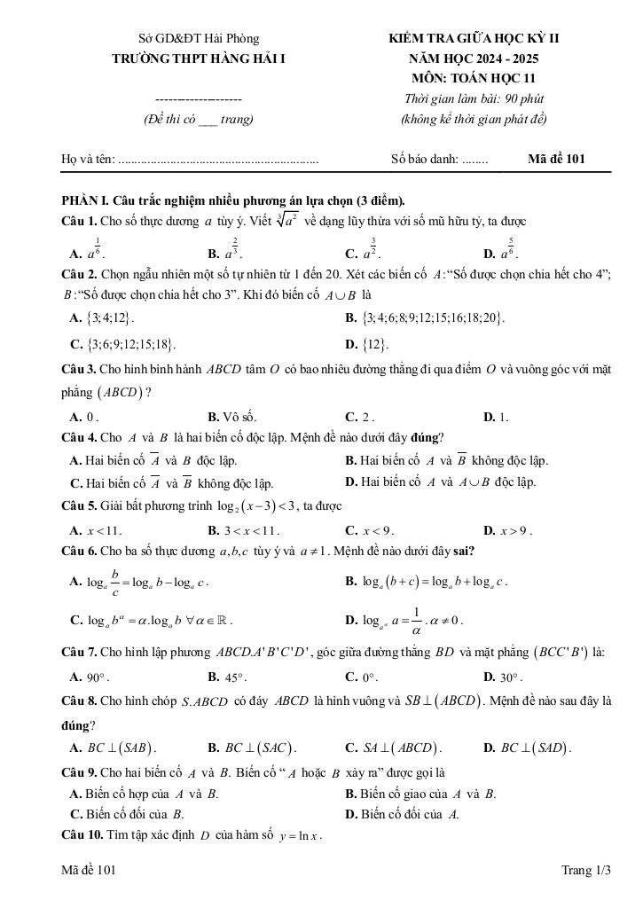 Trích dẫn Đề giữa học kì 2 Toán 11 năm 2024 – 2025 trường THPT Hàng Hải 1 – Hải Phòng: