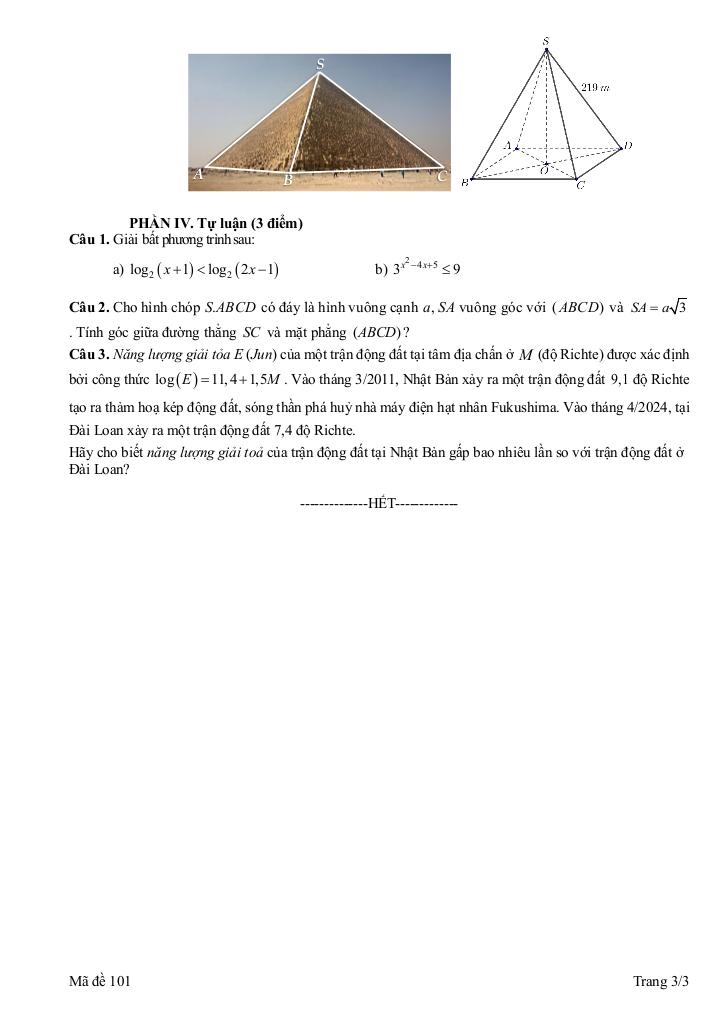 + Năng lượng giải tỏa E (Jun) của một trận động đất tại tâm địa chấn ở M (độ Richte) được xác định bởi công thức log(E) = 11,4 + 1,5M. Vào tháng 3/2011, Nhật Bản xảy ra một trận động đất 9,1 độ Richte tạo ra thảm hoạ kép động đất, sóng thần phá huỷ nhà máy điện hạt nhân Fukushima. Vào tháng 4/2024, tại Đài Loan xảy ra một trận động đất 7,4 độ Richte. Hãy cho biết năng lượng giải toả của trận động đất tại Nhật Bản gấp bao nhiêu lần so với trận động đất ở Đài Loan?