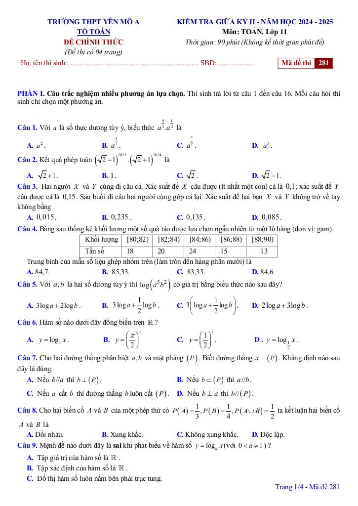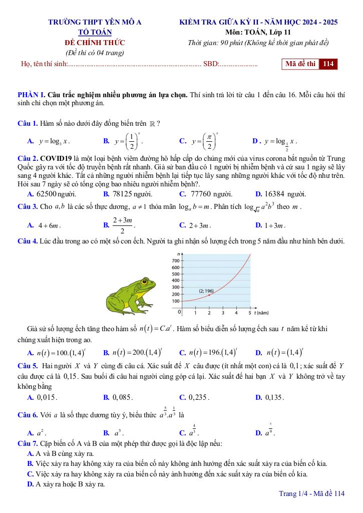 Toán học luôn là một môn học quan trọng, giúp học sinh phát triển tư duy logic và kỹ năng giải quyết vấn đề. Để hỗ trợ các bạn học sinh và giáo viên trong việc học tập và giảng dạy, bài viết này sẽ cung cấp lời giải chi tiết và đáp án chính xác cho chủ đề đề giữa học kì 2 toán 11 năm 2024 – 2025 trường thpt yên mô a – ninh bình, giúp bạn hiểu sâu và tự tin hơn khi làm bài tập.