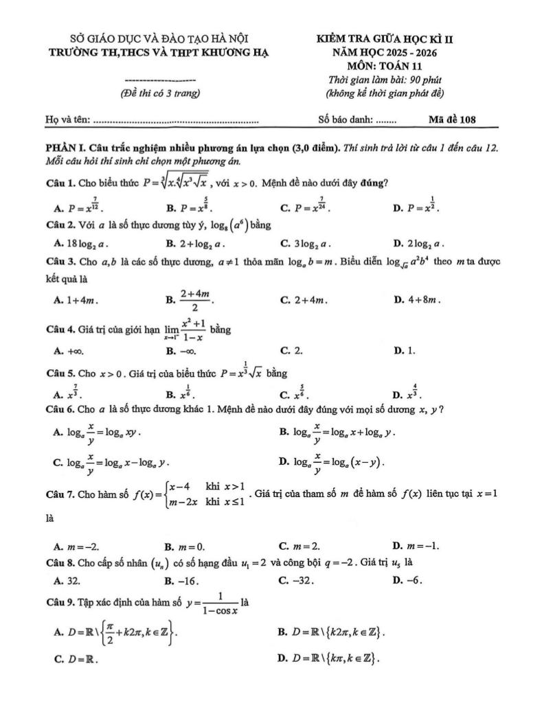 Trích dẫn Đề giữa học kì 2 Toán 11 năm 2025 – 2026 trường Khương Hạ – Hà Nội: